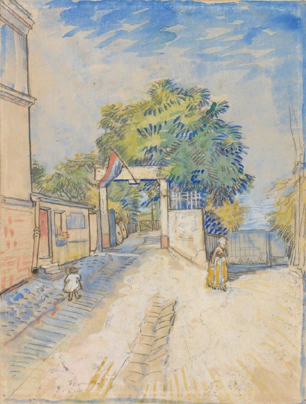 Van Gogh lived nearby. He made a number of drawings and paintings on the grounds of the mill. After dark, the narrow street was filled with people out for a good time. But Van Gogh chose a quiet daytime moment for his drawing. Could it have been a mistake that the Dutch flag is flying in his painting instead of the French one?