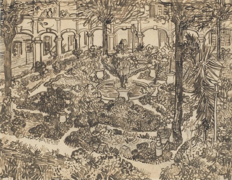 For months, Van Gogh looked out over this courtyard of the hospital in Arles. That was in the spring of 1889. He drew the lush garden while staying there for treatment of his mental condition.