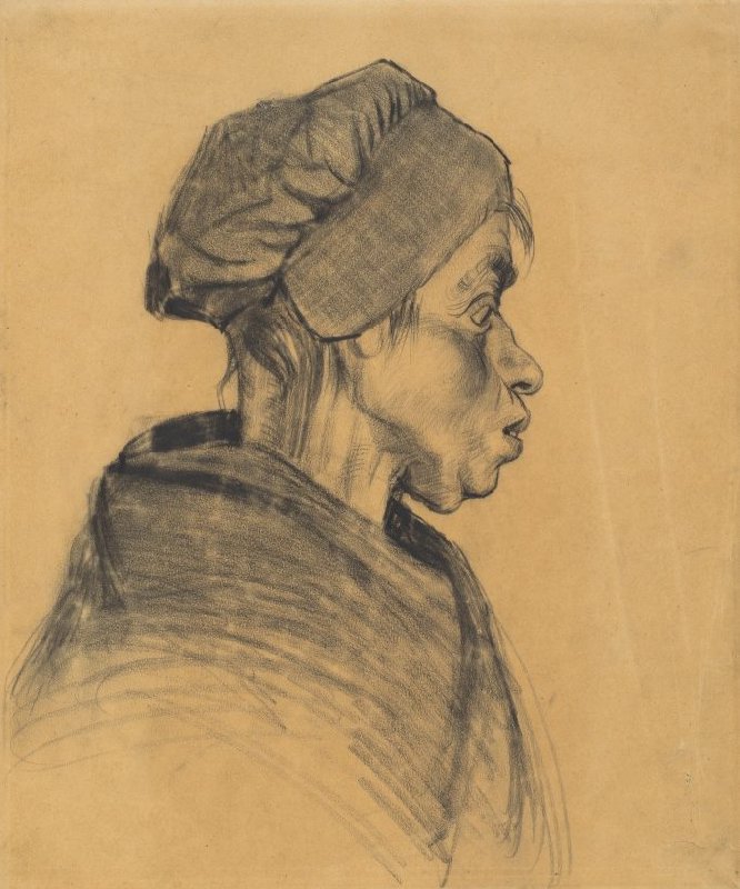 In the winter of 1884-1885, Van Gogh made a large series of drawings and paintings in Nuenen (NL): studies of heads. This portrait of a local farm worker with fairly coarse features was an ambitious drawing. It is twice the size of the other drawings in the series.