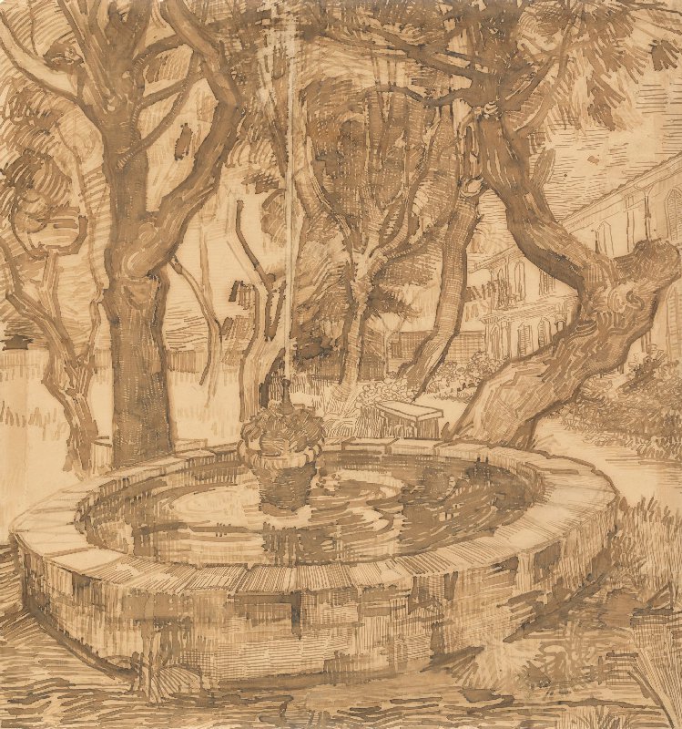 The fountain that Vincent depicted here was at the entrance to the men's wing. You can see the building on the right of the drawing. Vincent did something unusual with the jet of water. He scraped away the ink, exposing the fibres of the paper so that the water shines brightly.