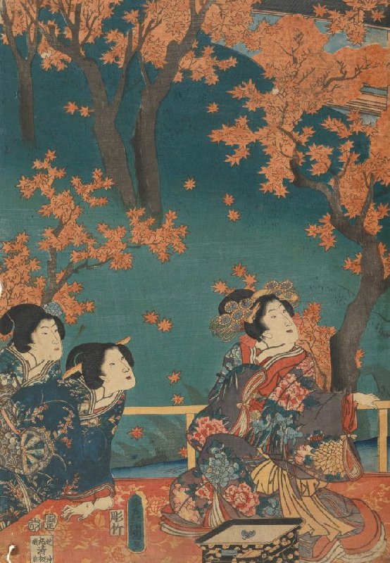 Courtesan with Two Attendants, left sheet of the triptych Red Maple Leaves at Tsūtenkyō Bridge