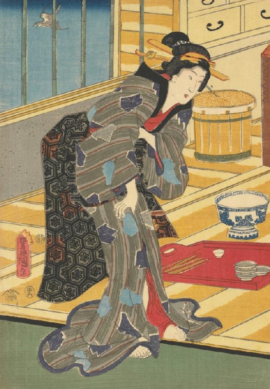 Woman Standing Next to Bowls and Chopsticks, left sheet of the triptych The Fourth Month: The First Cuckoo, from the series The Twelve Months