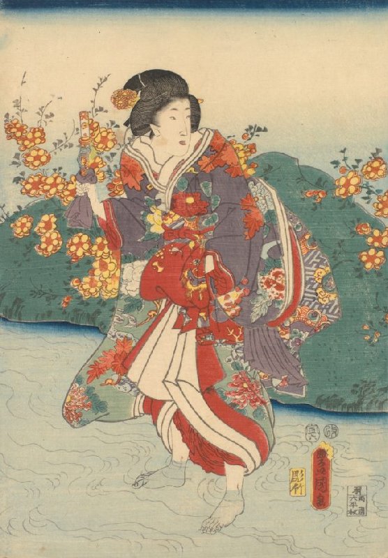 Woman Standing in a River, left sheet of the triptych The Ide Crystal River in Yamashiro Province, from an untitled series of beauties related to the Six Jewel Rivers