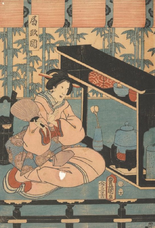 Court Lady Masaoka Seated Next to a Stand, left sheet of the diptych Three Actors in the Roles of Court Lady Masaoka, Senmatsu and Tsurukiyo