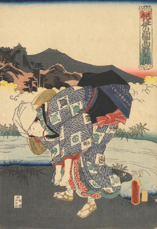 Woman Tying Her Sandal,right sheet of the triptych Kōya Crystal River in Kii Province