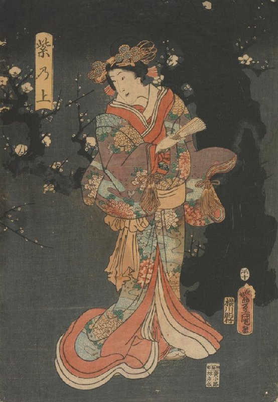 Enjoying Plum Blossom Viewing in the Spring Haze, Lady Murasaki no Ue, right sheet of a triptych