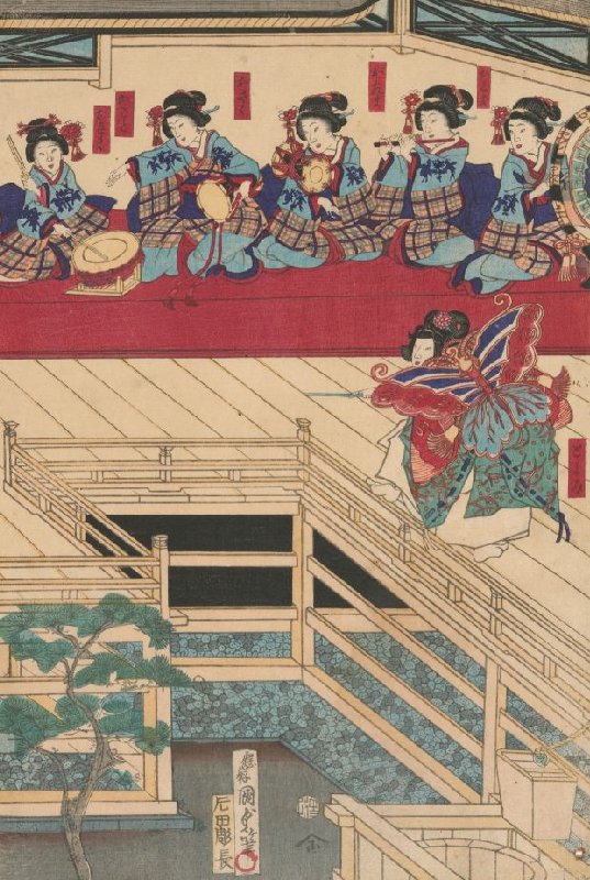 The Geisha Okiku, Okoto, Osaku, Otama and Otoyo and the Girl Toyomi as a Butterfly, right sheet of the triptych The Performance of 'Long Life of the Pine Tree, in Modern Style'