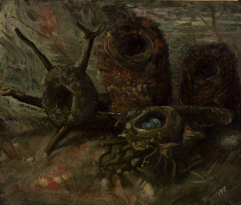 For a while, Van Gogh was fascinated with birds' nests. In 1885, he made them the subject of five still lifes in a row. He wrote to his brother Theo that he thought these would appeal to nature lovers, 'because of the colours of the moss, dry leaves and grasses, clay &c.'.