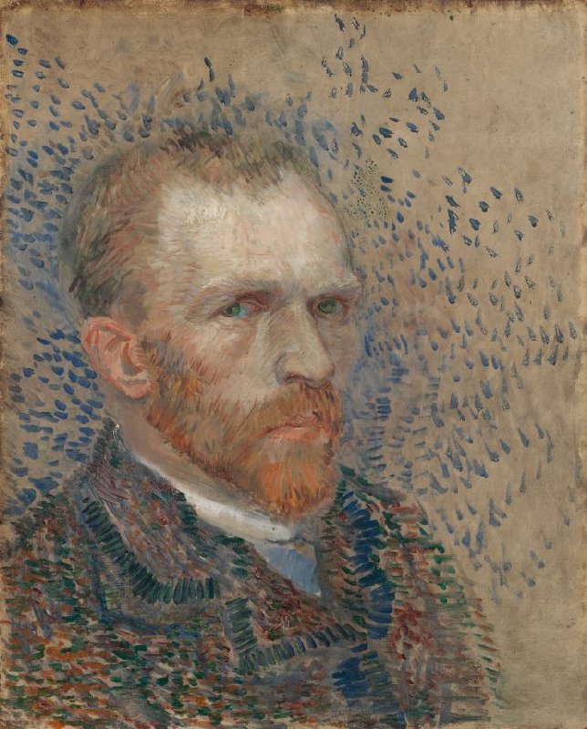 Around the world, people recognise this man with a red beard and an earnest look in his eyes. Vincent van Gogh painted about 35 self-portraits in total, most of them in Paris. For him, this was a way of practising portrait painting. His intention was not to portray himself as realistically as possible. He used the Neo-Impressionist style here, with short, rough brushstrokes. These alternate with longer strokes, such as the orange in his beard.