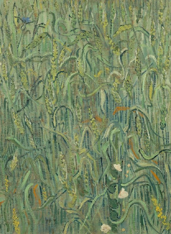 For this painting, Van Gogh must have stood in the middle of a wheatfield. He 'zoomed in' on the plants with their waving leaves and heavy stalks. The green sea of wheat is interrupted by a blue cornflower in the upper left and the pink bindweed in the lower right.