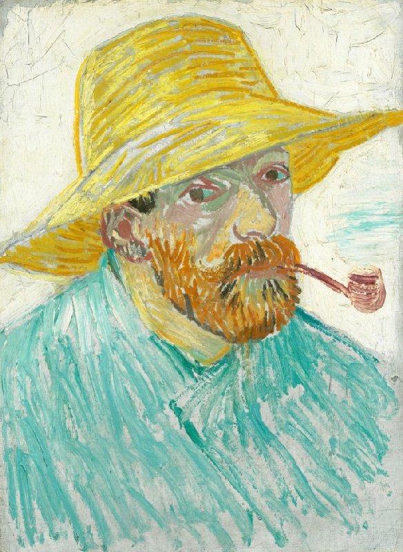 This sketchy self-portrait is an example of the amazingly rapid progress Van Gogh made in Paris. The summery palette and loose brushwork betray the influence of the Impressionists. The smock, hat and background consist of large, outlined areas of colour. The face and beard are built up in more detail using different tones.