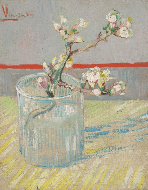 A red line divides the picture plane. Van Gogh used the same red to sign this small painting of a sprig of flowering almond. Almond trees are the first to blossom in the spring.