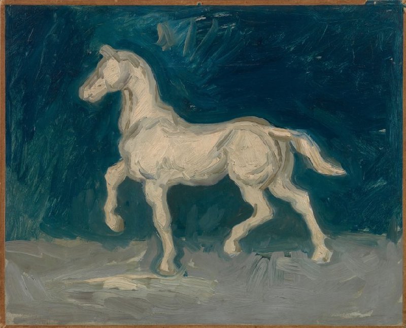 For this study in oils, Van Gogh used a small plaster model of a horse. He was then studying at the Antwerp art academy. There drawing was taught with the help of models like these, but painting had to be practiced at home. He painted this little horse on cardboard instead of canvas, because that was much cheaper.