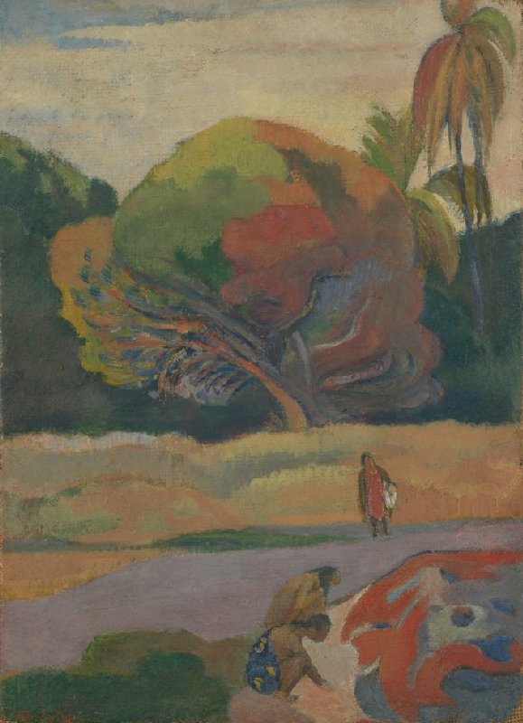 In this small Tahitian landscape, Gauguin plays with shapes and colours. For example, he has given the washing that fans out into the river clear-cut forms that turn it into almost abstract colour planes.