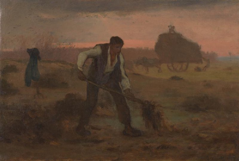 Spreading manure across the land by hand is hard work. Here Millet’s farmer is visibly toiling: he has draped his jacket and hat over a pitchfork and unbuttoned his shirt. The earthy tones in the foreground contrast with the soft pink glow of the sunset. Dusk announces the end of the workday, and with it a moment of rest for the labourer.