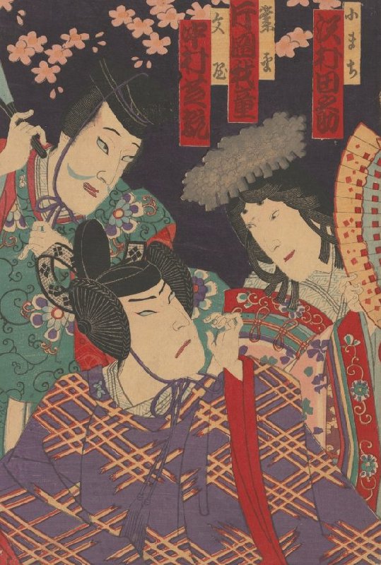 The Actors Sawamura Tanosuke in the Role of Komachi, Kataoka Gadō as Narihira, and Nakamura Shikan as Bun'ya, central sheet of a triptych