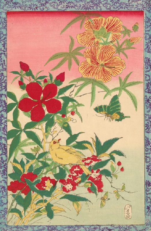 Autumn Flowers, Yellow Bird, and Insects