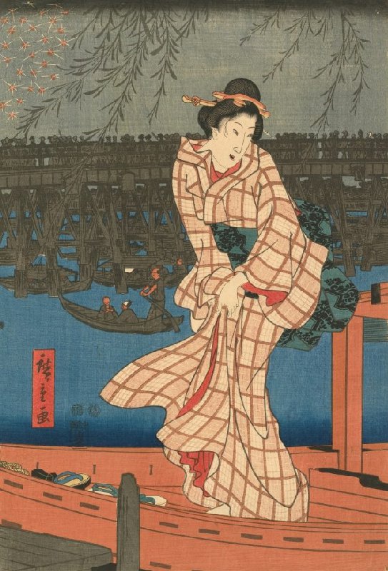 Evening Cool and Great Fireworks at Ryōgoku, central sheet of a triptych