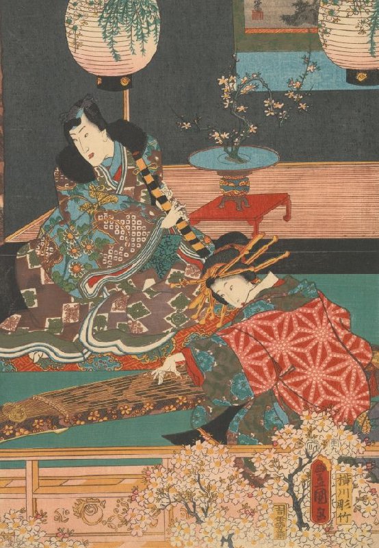 Rustic Genji Playing Flute and Courtesan Playing Koto, central sheet of the triptych Flowers, from the triptych series Snow, Moon, and Flowers of the Eastern Genji