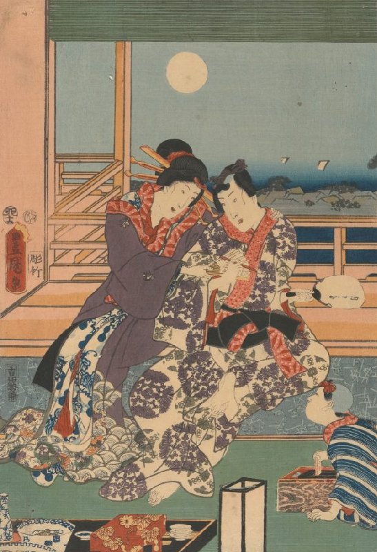 Courtisan Sitting Next to Rustic Genji, central sheet of the triptych Moon, from the triptych series Snow, Moon, and Flowers of the Eastern Genji