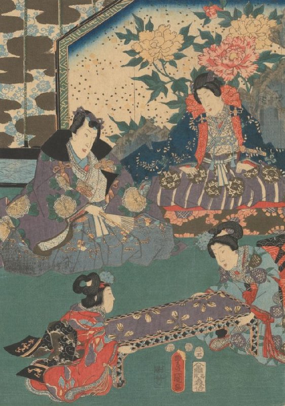 Rustic Genji with Companian and Two Young Attendants, left sheet from the triptych Lady Umetsubo
