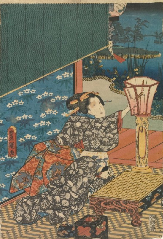 Woman Lighting a Candle, central sheet of a triptych Figures in Edo Purple: The Utsusemi Chapter [from the Tale of Genji]