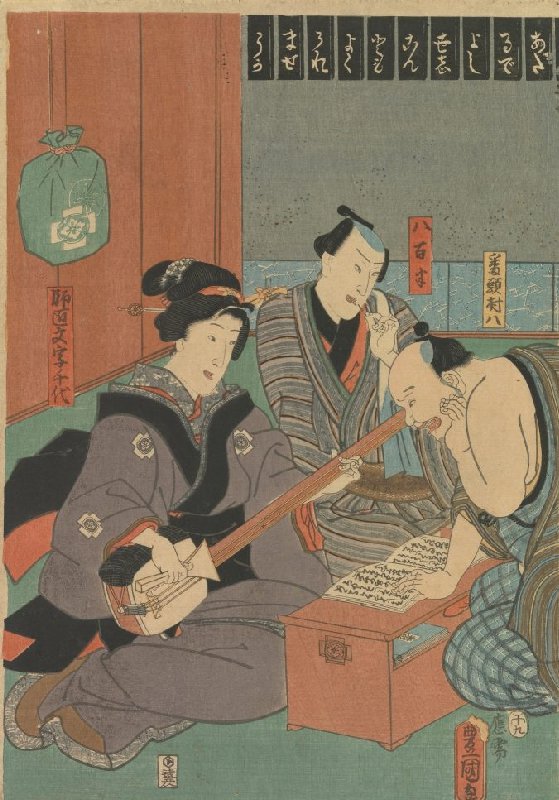 Teacher Mojichiyo Given Singing Lessons to Bantō Murahachi and the Greengrocer, one sheet of a diptych or triptych
