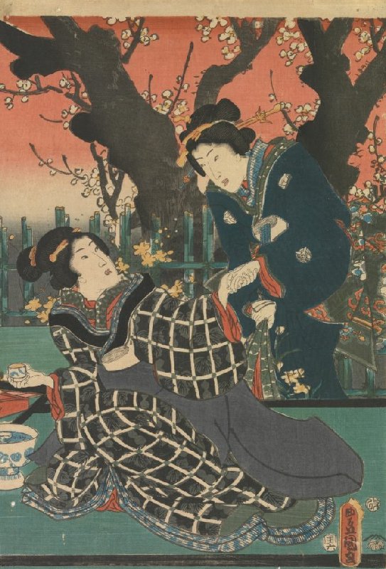 Two Women in a Garden, central sheet of the triptych The Second Month: Plum Blossom Viewing, from the series The Twelve Months