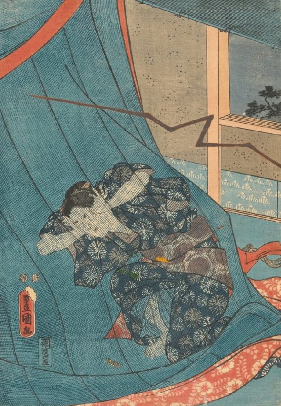 Woman Hiding Under Mosquito Net, left sheet of triptych A Sudden Summer Shower