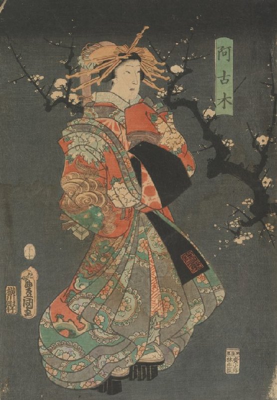 Enjoying Plum Blossom Viewing in the Spring Haze, the Courtesan Akogi, left sheet of a triptych