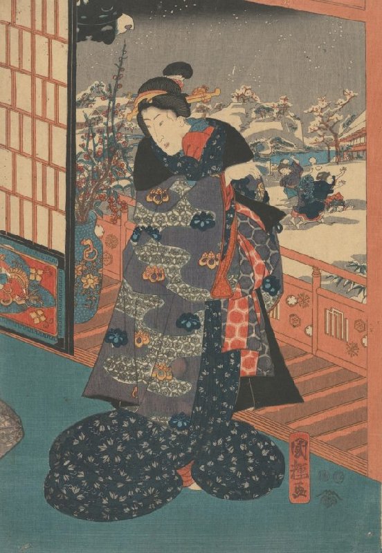 Standing Woman with a View of a Snow-covered Garden, central sheet of the triptych Snow, from the series Snow, Moon and Flowers