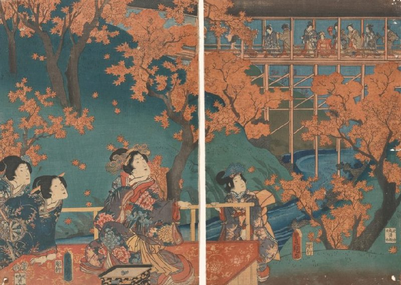 Red Maple Leaves at Tsūtenkyō Bridge, central and left sheet of a triptych