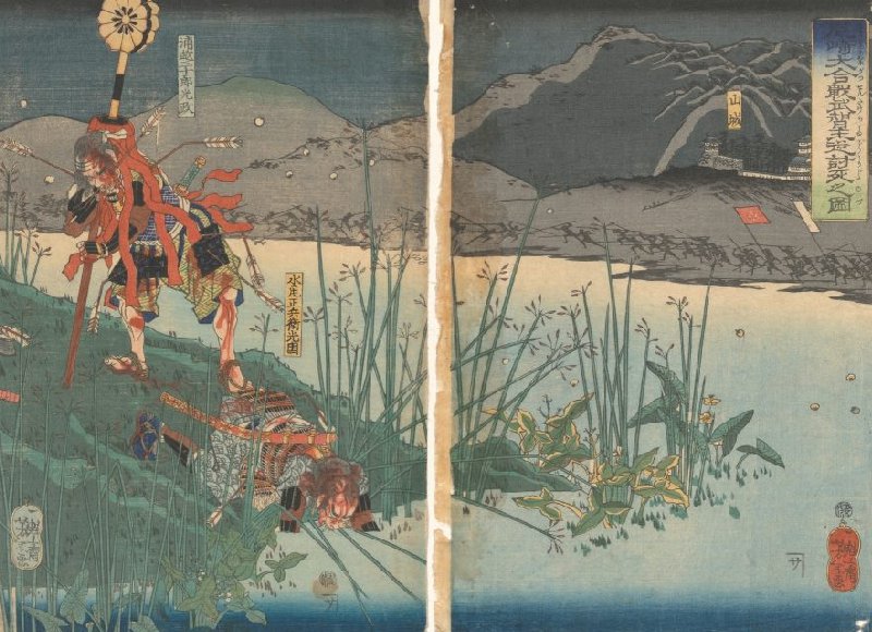 Illustration of the Death of Leaders and Vassals of the Takechi [Akechi] Clan at the Great Battle of Amagasaki, right and central sheet of a triptych