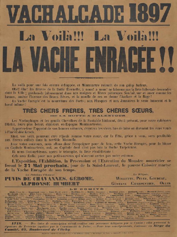 - VACHALCADE 1897 La voilà !!! La voilà !!! LA VACHE ENRAGÉE!! [wervende tekst ter promotie van de festiviteiten] [opsomming van de organiserende leden] [mogelijkheid tot inlichtingen] , tot de organisatie behoorden o.a. Puvis de Chavannes, Gérome, Willette, Toulouse-Lautrec, Redon en Somm