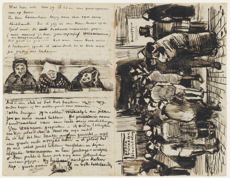 Letter to Theo van Gogh with sketches of Church Pew with Worshippers, Back of the Head of an Orphan Man and The Poor and Money (verso)