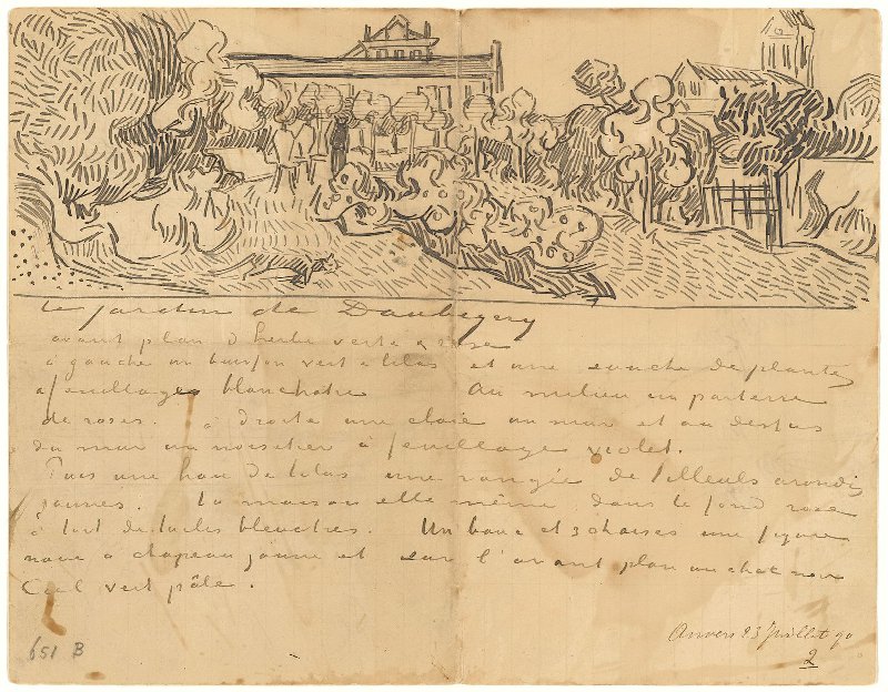 Letter from Vincent van Gogh to Theo van Gogh with sketches of Daubigny’s Garden, Wheatfields, Thatched Cottages and Figures and Wheatfields