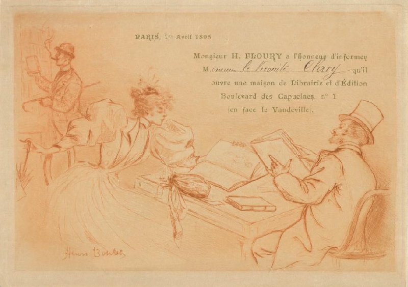 - PARIS, 1er Avril 1895 Monsieur H. FLOURY a l'honneur d'informer M.onsieur le Vicomte Clary qu'il ouvre une maison de Librairie et d'Édition Boulevard des Capucines, no 1 (en face le Vaudeville).