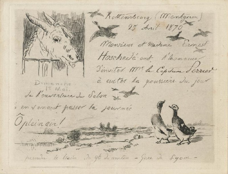 - Rottembourg (Montgeron) 25 Avril 1870 Monsieur et Madame Ernest Hoschedé ont l'honneur d'inviter M: Le Captain Perrier à eviter la poussière du jour de l'ouverture du Salon en verrant passer la journée Ô plein air! prendre le train de 9h du matin - Gare de Lyon - by Bracquemond, Félix