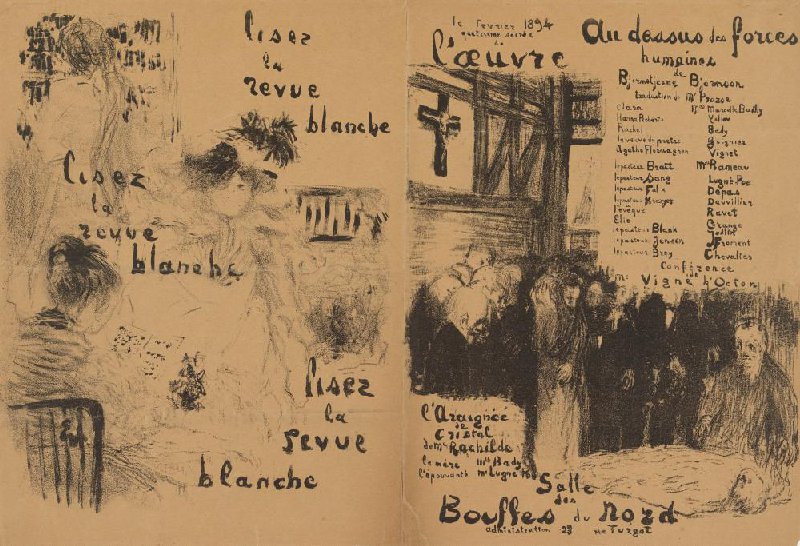 Theatre programme for Au-dessus des forces humaines by Bjørnstjerne Bjørnson and L'araignée de cristal by Rachilde (Théâtre de l'Oeuvre, 13 February 1894) and an advertisement for the journal La Revue blanche