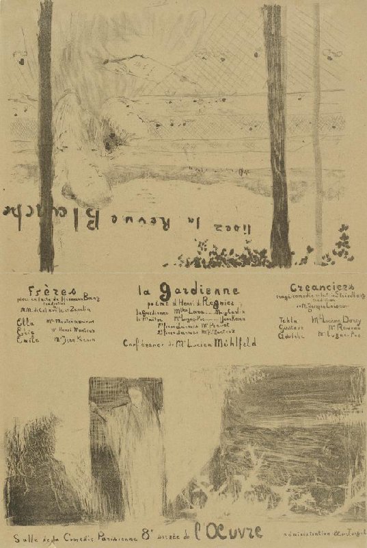 Theatre programme for Frères by Hermann Bang, La gardienne by Henri de Régnier and Créanciers by August Strindberg (Théâtre de l'Oeuvre, 21 June 1894) and an advertisement for the journal La Revue blanche