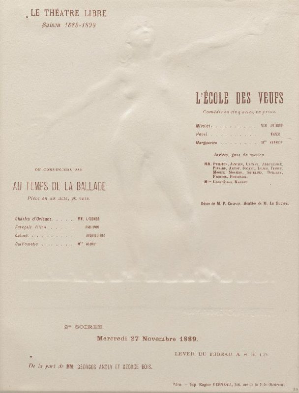 - LE THÉATRE LIBRE Saison 1889-1890 on commencera par AU TEMPS DE LA BALLADE Pièce en un acte, en vers. [rolverdeling] L'ÉCOLE DES VEUFS Comédie en cinq actes, en prose. [rolverdeling] [decorontwerp en decorstukken] 2me soirée. Mercredi 27 Novembre 1889. Lever du rideau a 8 H. 1/2. De la part de MM. GEORGES ANCEY ET GEORGE BOIS. Paris. - Imp. Eugène VERNEAU, 108, rue de la Folie-Mericourt.