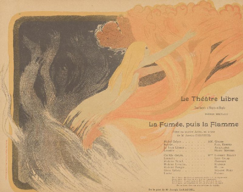 - Le Théâtre Libre Saison 1895-1896 premier spectacle La Fumée, puis la Flamme Pièce en quatre Actes, en prose de M. Joseph CARAGUEL [rolverdeling] [dagen waarop de verschillende aktes worden opgevoerd] De la part de Mr Joseph CARAGUEL