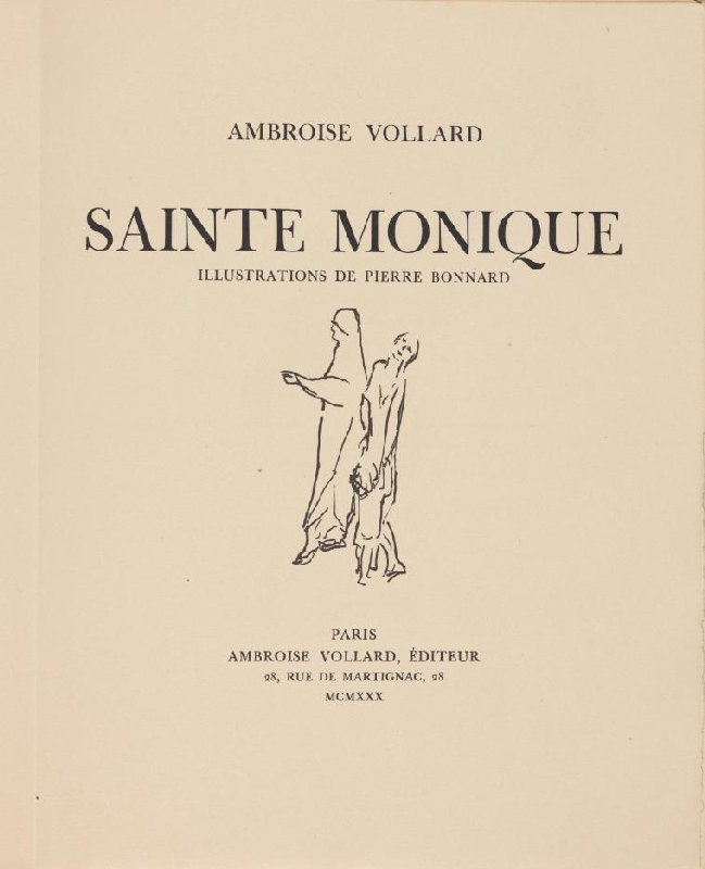 - AMBROISE VOLLARD SAINTE MONIQUE ILLUSTRATIONS DE PIERRE BONNARD [ILLUSTRATIE] PARIS AMBROISE VOLLARD, ÉDITEUR 28, RUE DE MARTIGNAC, 28 MCMXXX
