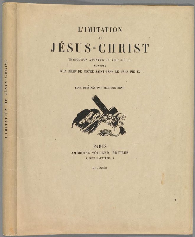 - L'IMITATION DE JÉSUS-CHRIST TRADUCTION ANONYME DU XVIIe SIÈCLE HONORÉE D'UN BREF DE NOTRE SAINT-PÈRE LE PAPE PIE IX BOIS DESSINÉS PAR MAURICE DENIS PARIS AMBROISE VOLLARD, ÉDITEUR 6, RUE LAFFITTE, 6 MDCCCCIII