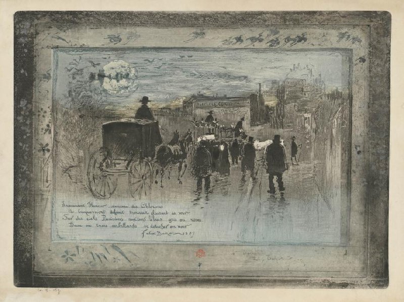 - Insouciant Flaneur, ennemi des Chloroses Ce Croquemont defunt trouvait plaisant de voir Sur des ciels Parisiens aux tons bleus gris ou roses Deux ou trois corbillards se detacher en noir Félix Buhot 1887 by Buhot, Félix Hilaire