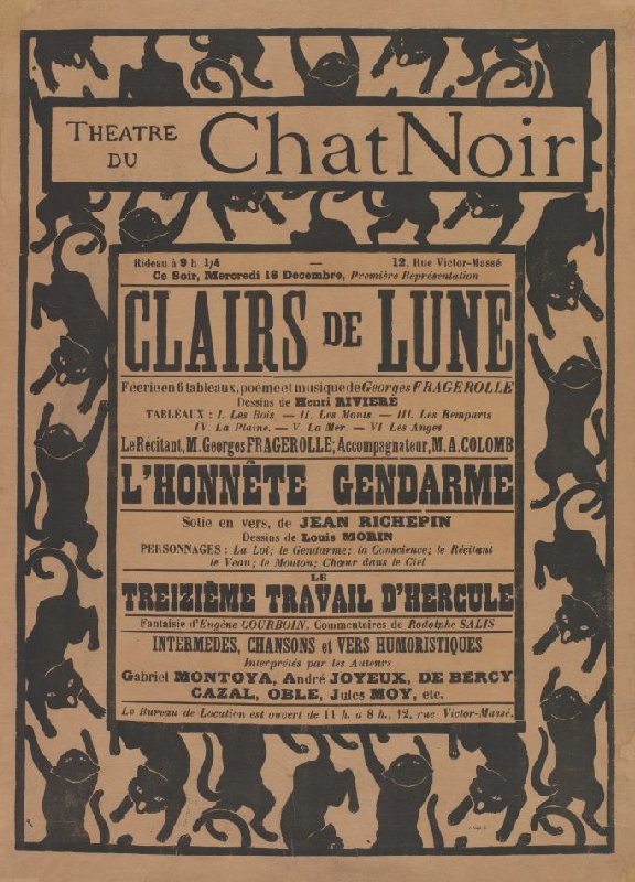 - Rideau à 9 h 1/4 - 12, Rue Victor-Massé Ce Soir, Mercredi 16 Décembre, Première Représentation CLAIRS DE LUNE Féerie en 6 tableaux, poème et musique de Georges FRAGEROLLE Dessins de Henri RIVIÈRE [aktes van het schaduwspel] Le Récitant, M. Georges FRAGEROLLE; Accompagnateur, M.A. COLOMB L'HONNÊTE GENDARME Sotie en vers, de JEAN RICHEPIN Dessins de Louis MORIN [personages van het schaduwspel] LE TREIZIÈME TRAVAIL D'HERCULE Fantaisie d'Eugène COURBOIN, Commentaires de Rodolphe SALIS INTERMEDES, CHANSONS er VERS HUMORISTIQUES [artiesten die de randprogrammering verzorgen] Le Bureau de Location est ouvert de 11 h. à 8 h., 12, rue Victor-Massé.