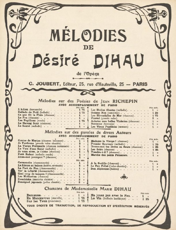 Sheet music Les vieux papillons by Jean Richepin and Désiré Dihau, performed by Madame Judic, from the series Mélodies de Désiré Dihau