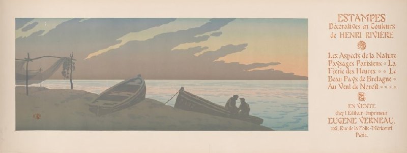 - ESTAMPES Décoratives en Couleurs de HENRI RIVIÈRE [monogram Henri Rivière] Les Aspects de la Nature Paysages Parisiens * La Féerie des Heures ** Le Beau Pays de Bretagne * Au Vent de Noroît. **** [monogram Eugène Verneau] EN VENTE Chez l'Éditeur-Imprimeur EUGÈNE VERNEAU, 108, Rue de la Folie-Méricourt Paris.