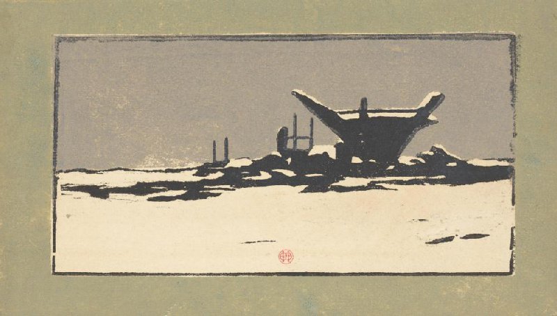 woodcut in three colours on watercolour paper, 16.4 cm x 28.1 cm