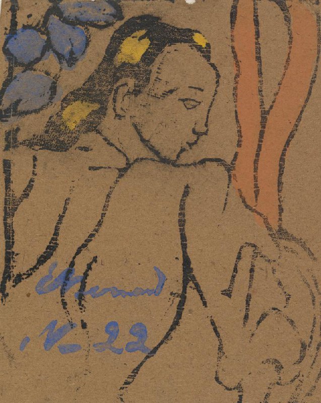 woodcut in black, coloured by hand with watercolour, on brown wove paper, 15.8 cm x 12.8 cm